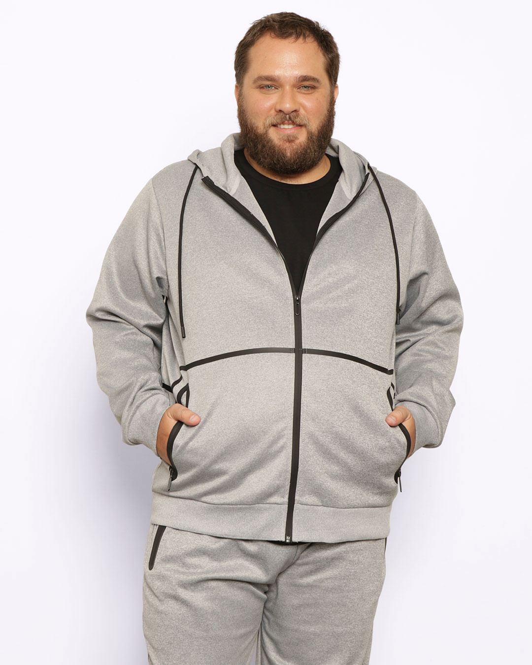 Jaqueta plus size masculina confeccionado em helanca. Possui capuz com cordão de ajuste embutido, manga longa, bolso frontal com fechamento por zíper. punho e barra em ribana e costura padrão.