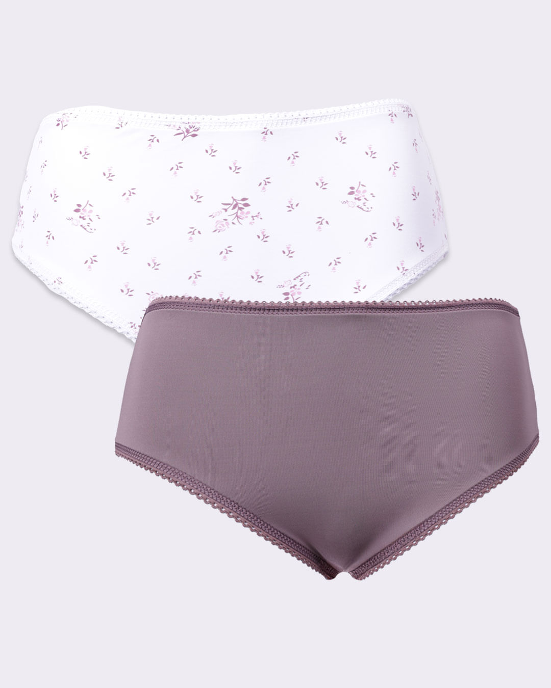 Kit 2 Calcinhas confeccionada em tecido poliamida. Possui modelo biquíni, acabamento em elástico rendado, kit com uma calcinhas lisa bege e uma branca estampada, forro algodão confortável e linda. Acabamento padrão.