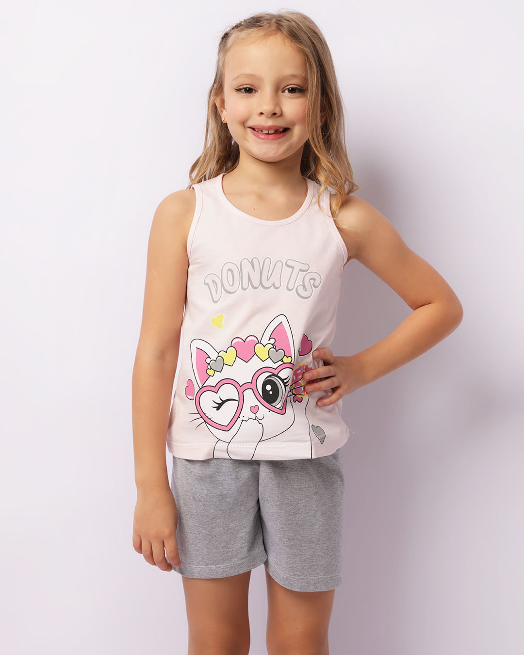 Pijama infantil confeccionado em algodão, possui blusa com gola redonda, regata, estampa gatinho. Acompanha short com elástico no cós, barra comum, com costura e acabamento padrão.