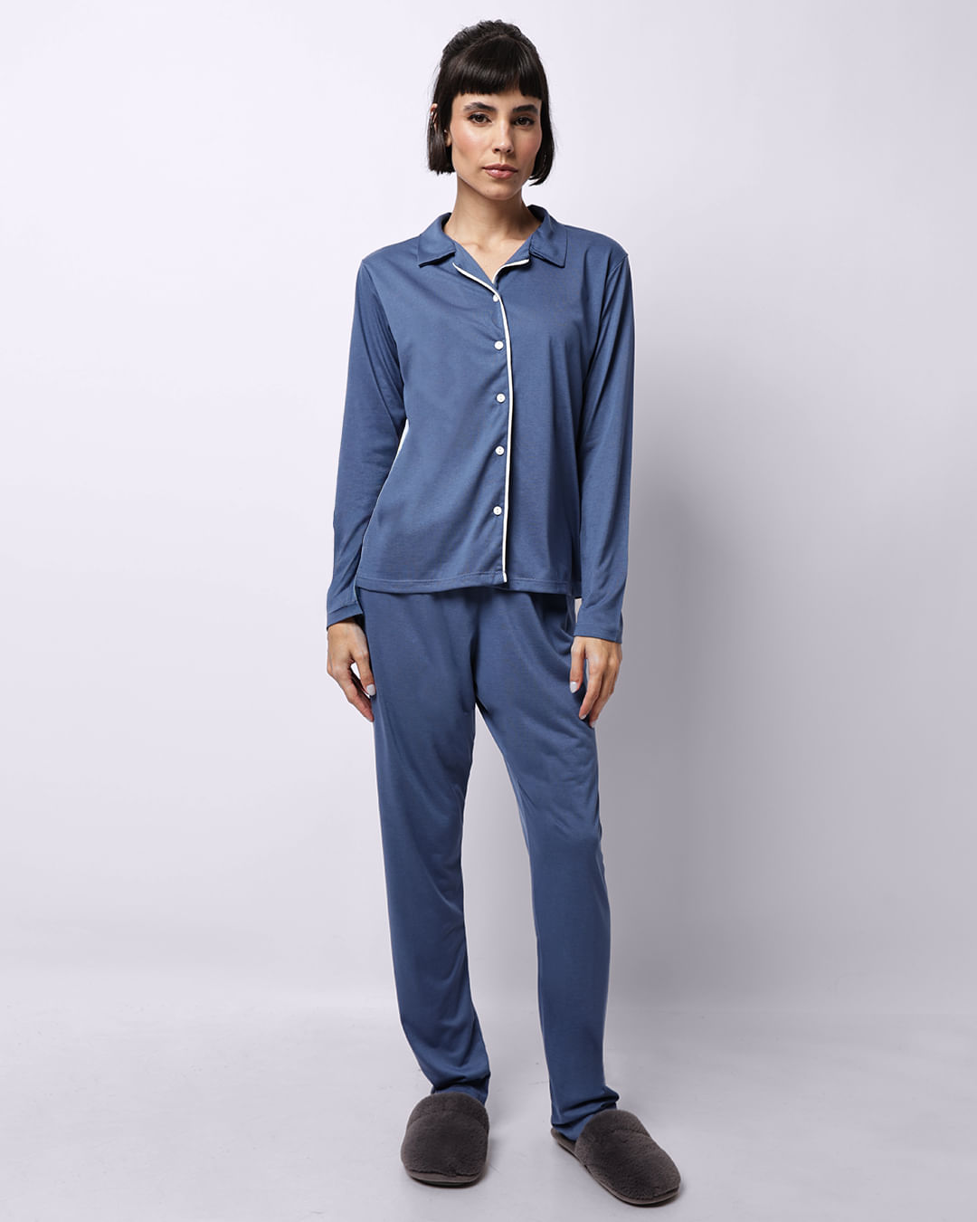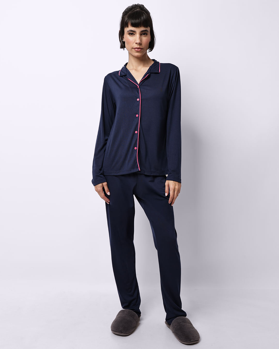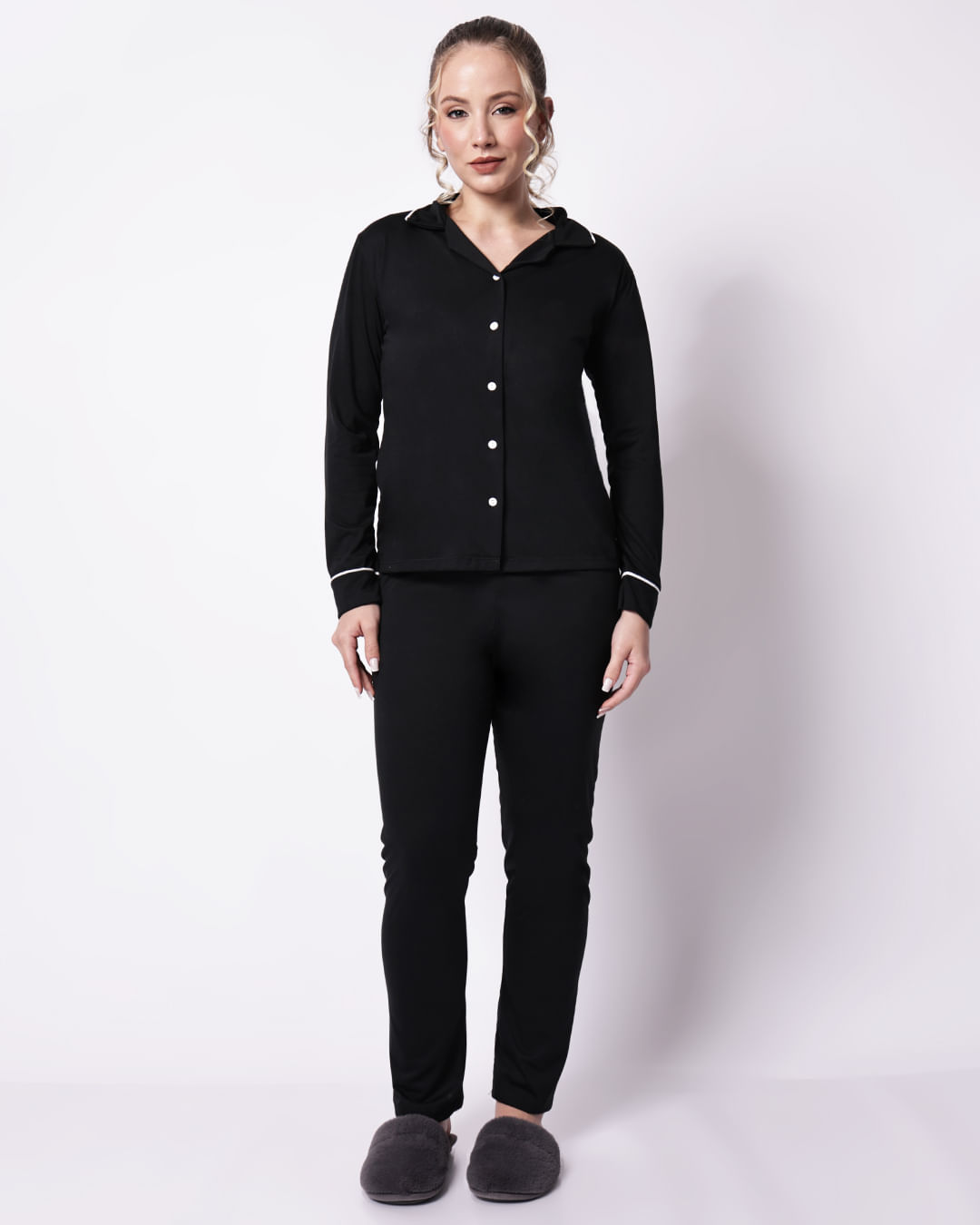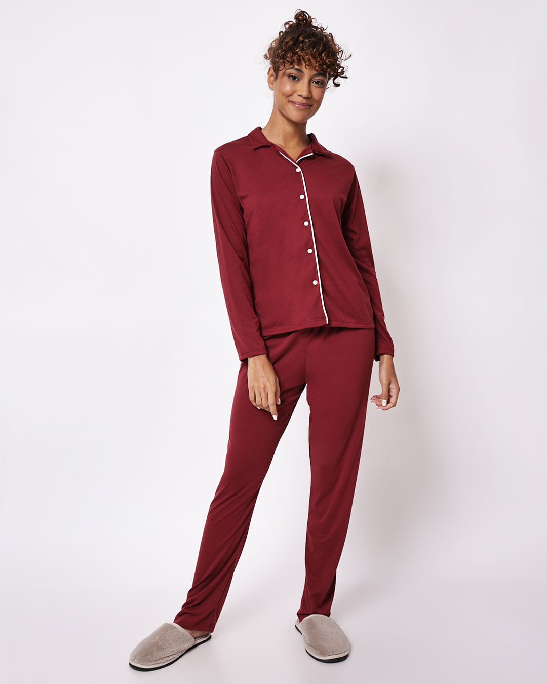 Mais detalhes: Pijama feminino confeccionado em tecido macio e leve, proporcionando toque suave, conforto térmico e sensação agradável ao vestir, ideal para noites de descanso. O modelo estilo americano é composto por blusa de manga longa com gola tradicional, abertura frontal com botões e modelagem soltinha que garante praticidade e liberdade de movimentos. A parte superior conta com acabamento delicado e caimento confortável, enquanto a calça possui modelagem reta com cós elástico que se ajusta suavemente ao corpo. O conjunto oferece visual clássico e elegante, sendo uma ótima opção para momentos de relaxamento e para quem busca conforto aliado a um estilo atemporal.