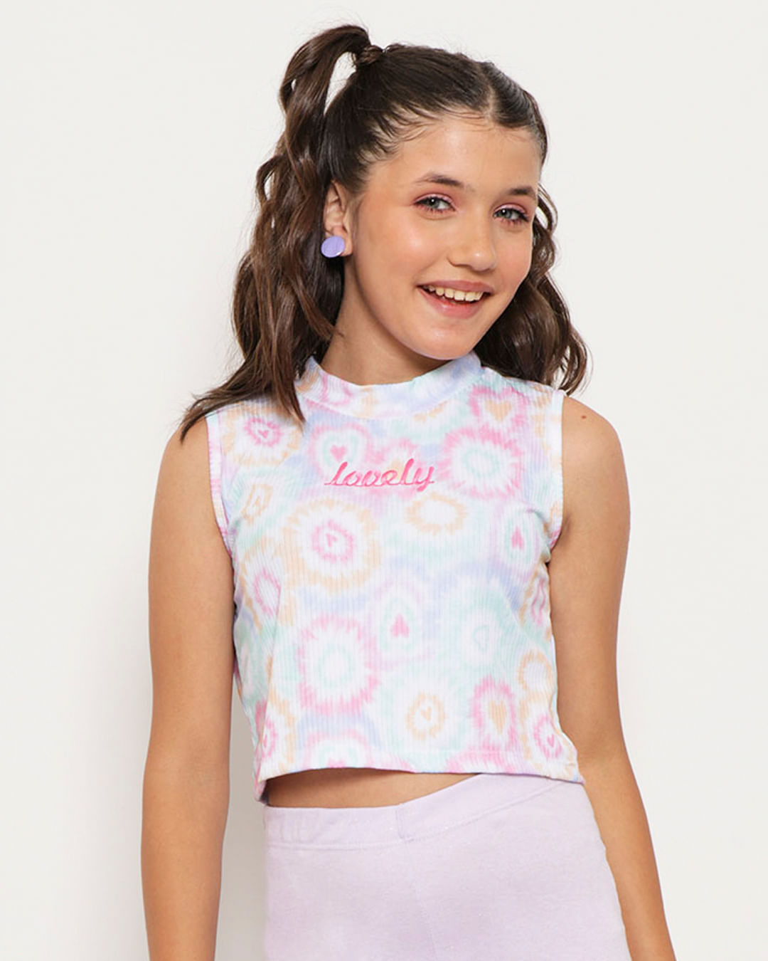 Regata juvenil modelo cropped ideal para adolescentes de 10 a 16 anos, confeccionada em tecido canelado. Possui gola redonda, detalhe frase bordada, estampa tie dye, acabamento e costura no tom.
