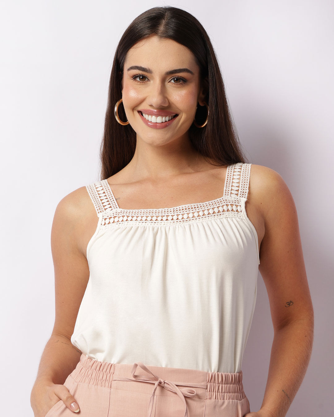 Regata feminina confeccionada em malha de viscose , possui decote reto, detalhe em renda nas alças e barra comum com costura e acabamento padrão.