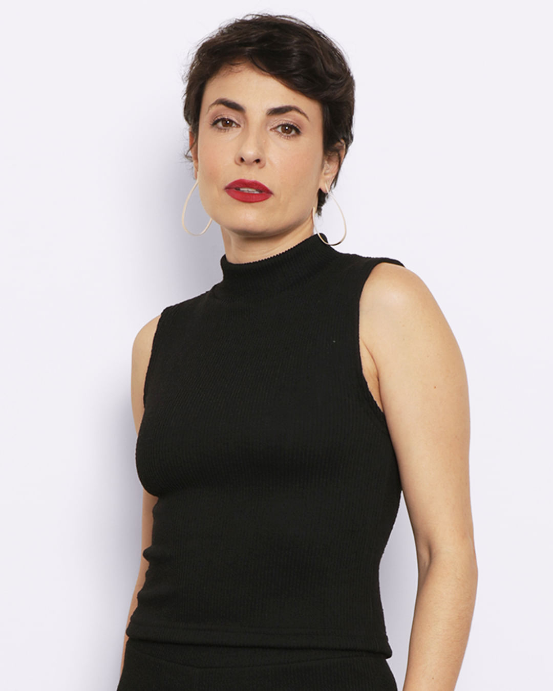 Regata feminina confeccionada em malha canelada, possui gola alta redonda, cavas sem mangas e barra comum com costura e acabamento padrão.