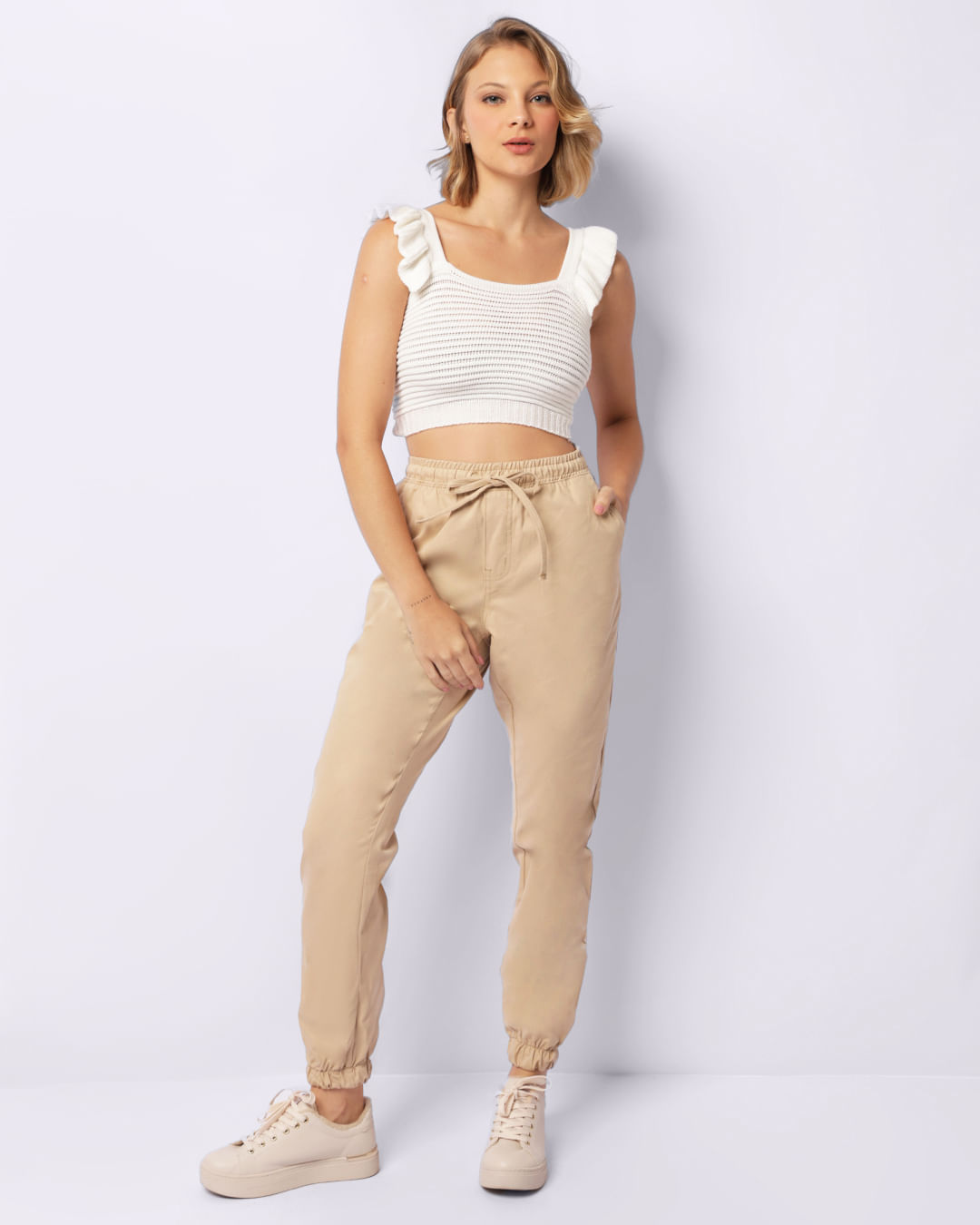 Regata cropped feminina confeccionada em tricô. Possui decote reto, comprimento cropped, alças com babados. com costura e acabamento padrão.