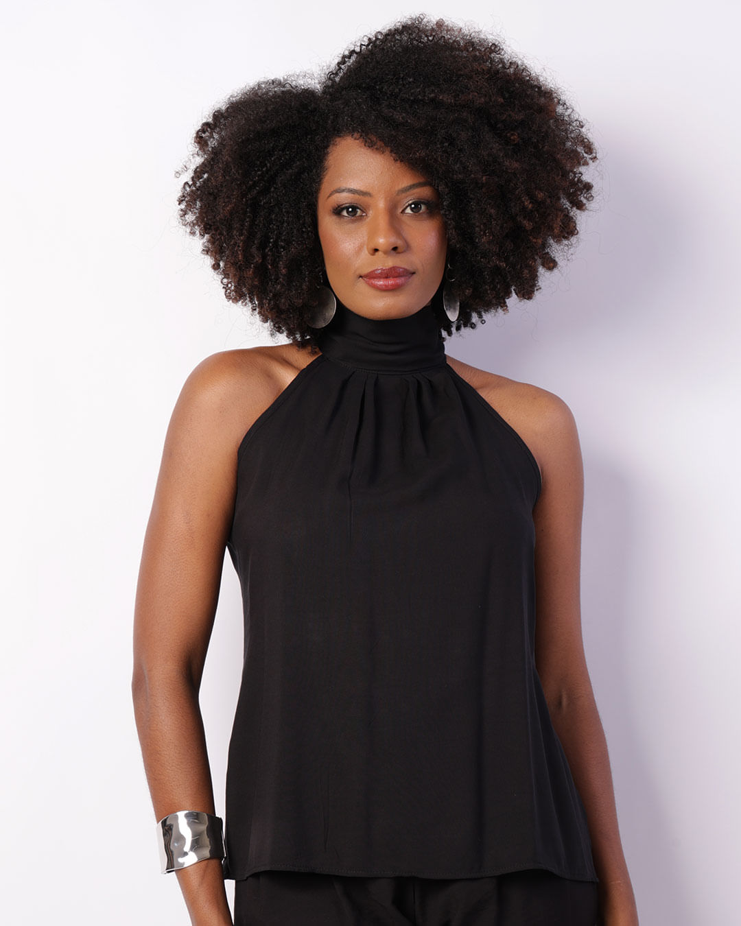 Mais detalhes: Regata feminina confeccionada em viscose, possui modelagem padrão, gola alta com amarração posterior e barra comum, peça fluida com costura e acabamento padrão.