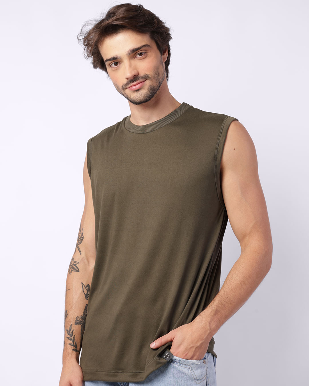 Mais detalhes: Regata masculina possui modelagem padrão com gola careca canelada e barra comum, peça com toque macio com costura e acabamento padrão.