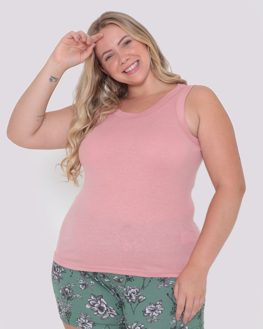 Regata feminina plus size confeccionada em malha canelada. Possui decote redondo, cavas sem mangas, acabamento e costura padrão.
