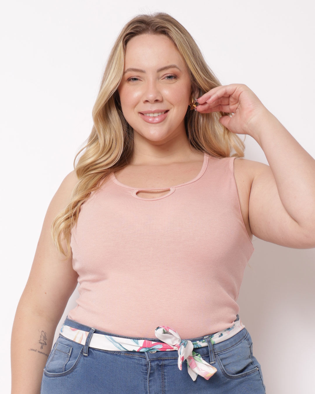 Regata feminina Plus Size confeccionada em malha canelada. Possui decote redondo com recorte frontal, modelagem ajustada ao corpo e barra simples.