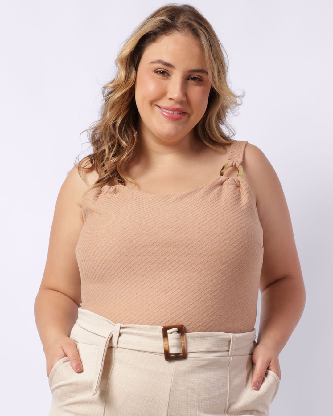 Mais detalhes: Regata feminina plus size, confeccionada em poliéster com algodão. Possui modelagem padrão, alças com aviamento argolas douradas, tecido texturizado e decote redondo. Costura e acabamento padrão;)