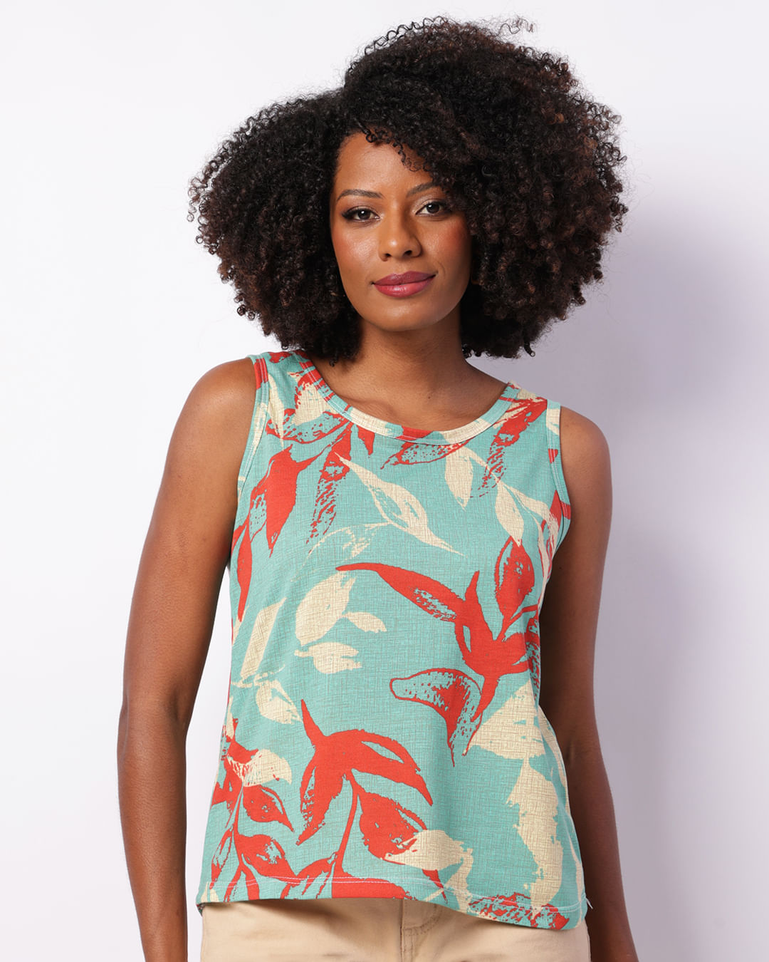 Regata feminina confeccionado em malha, possui modelagem padrão com cavas sem manga, decote em redondo e barra comum, peça estampada com costura e acabamento padrão.