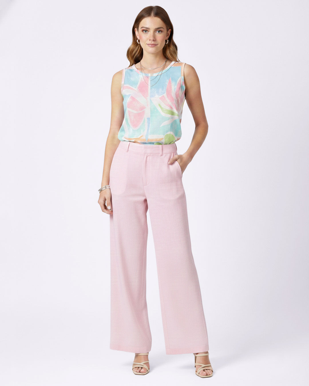 Regata feminina confeccionado em malha, possui modelagem padrão com cavas sem manga, decote em redondo e barra comum, peça estampada com costura e acabamento padrão.