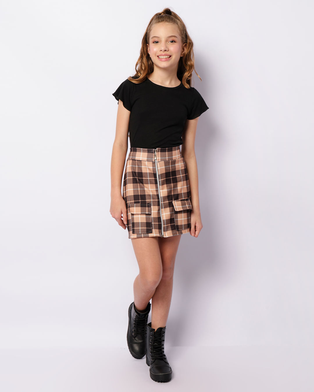 Mais detalhes: Saia juvenil confeccionada em malha. Possui Bolsos e Zíper frontal, comprimento curto, barra simples com costuras e acabamentos padrão. Ideal para compor aquele look de São João.