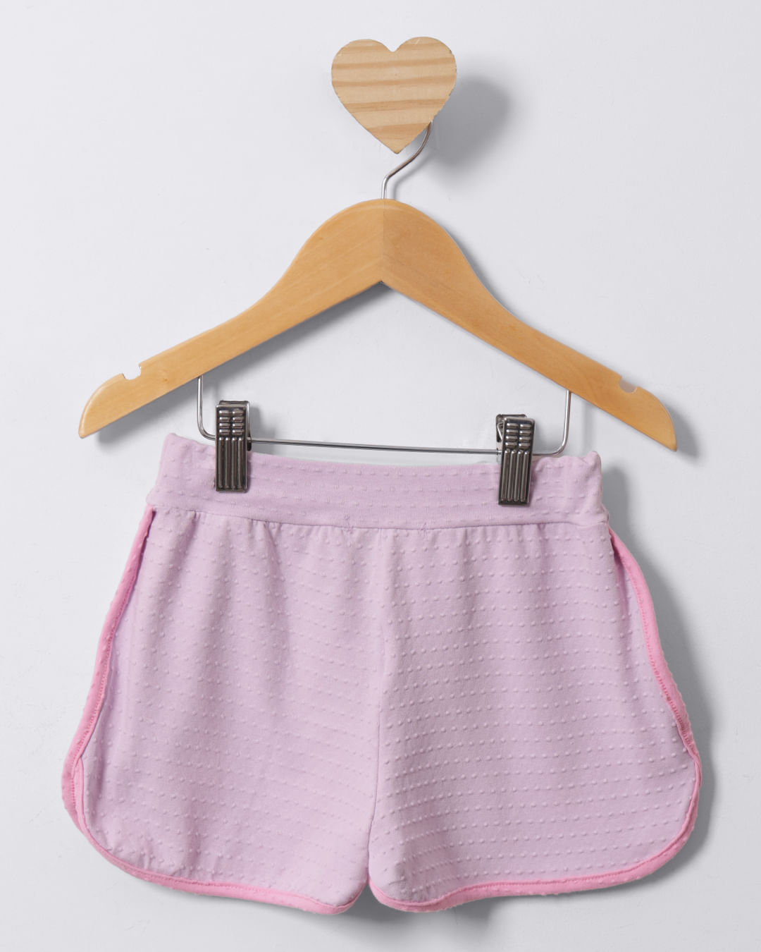 Short bebê confeccionado em tecido malha texturizada. Possui cós com elástico, modelagem boxer, barra simples. Acabamento e costura padrão.