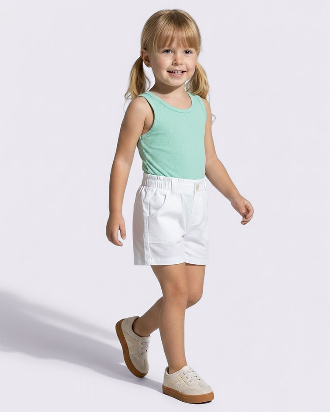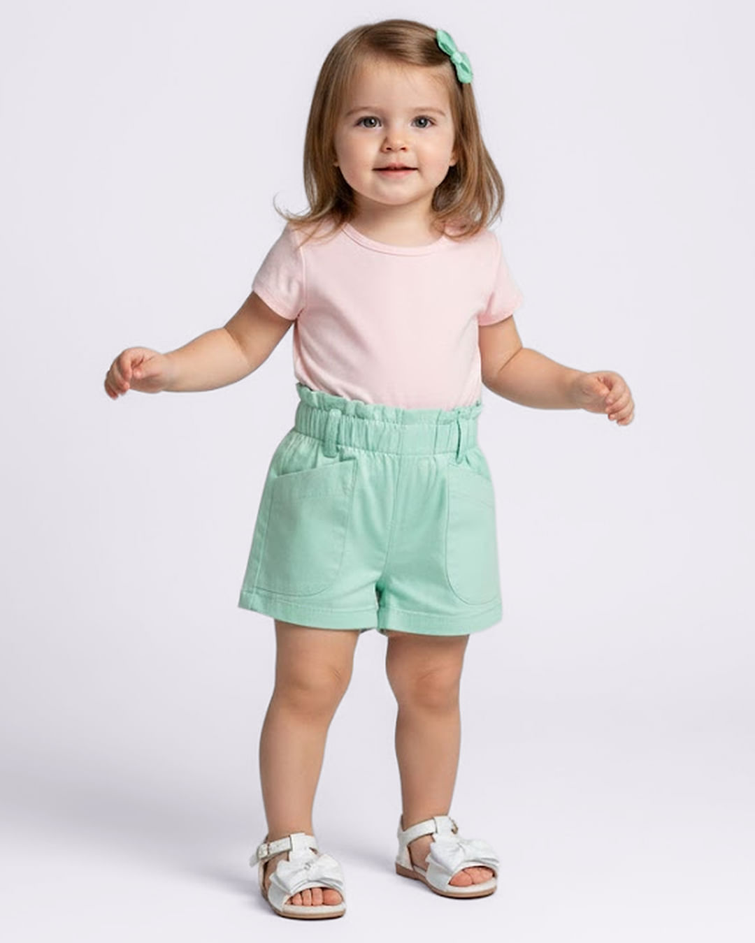 Mais detalhes: Short bebê, paper bag. Cós com elástico e botão. Bolsos frontais, com acabamento e costura padrão.