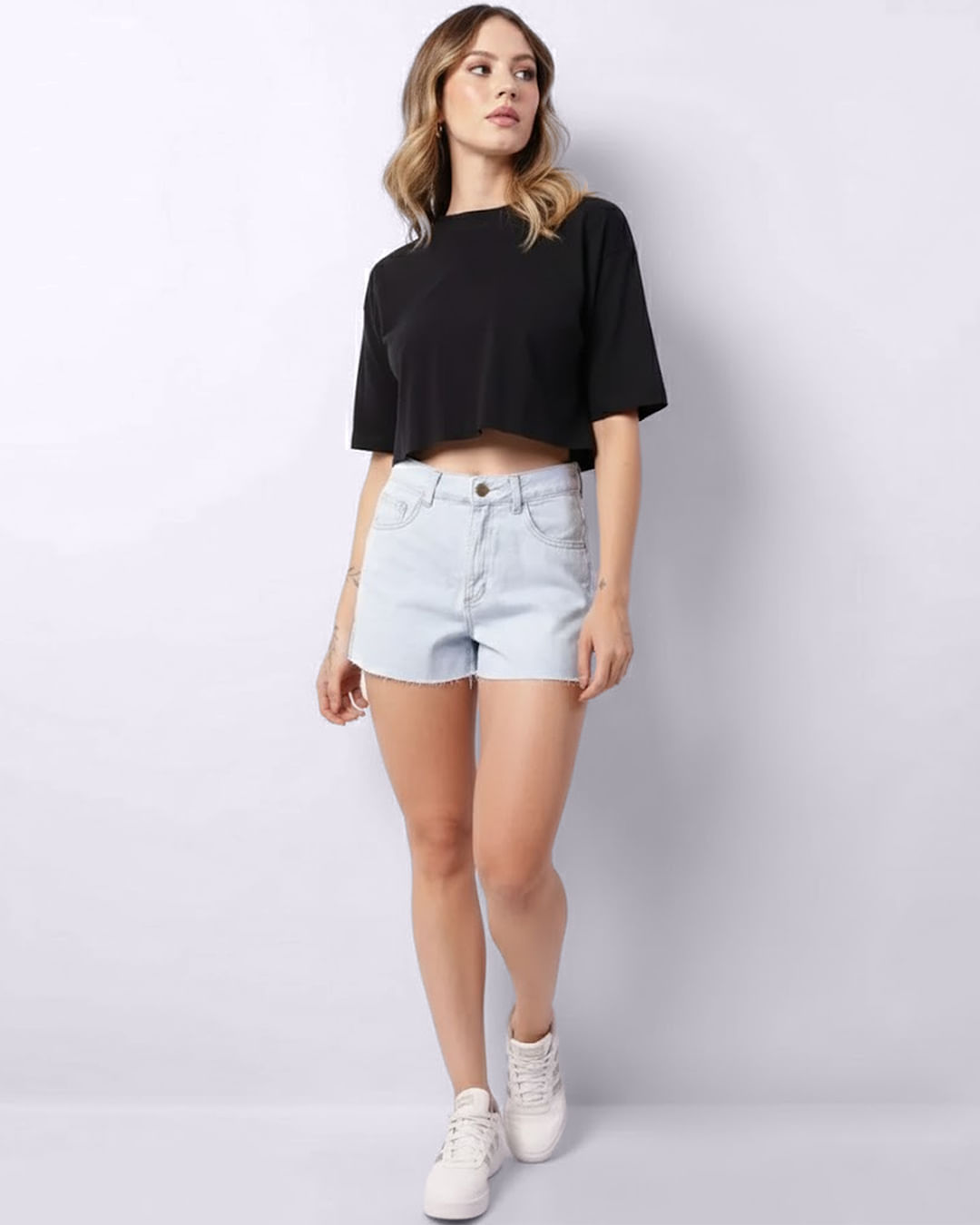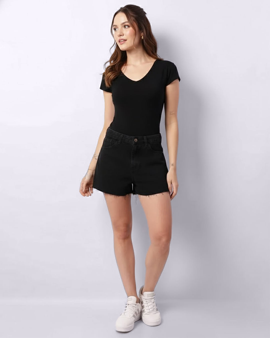 Mais Detalhes: Short feminino confeccionado em jeans. Possui cós com passantes, modelagem curta, com bolsos frontais e posteriores, barra desfiada, pequenas aberturas na lateral da barra, com costura acabamento padrão.