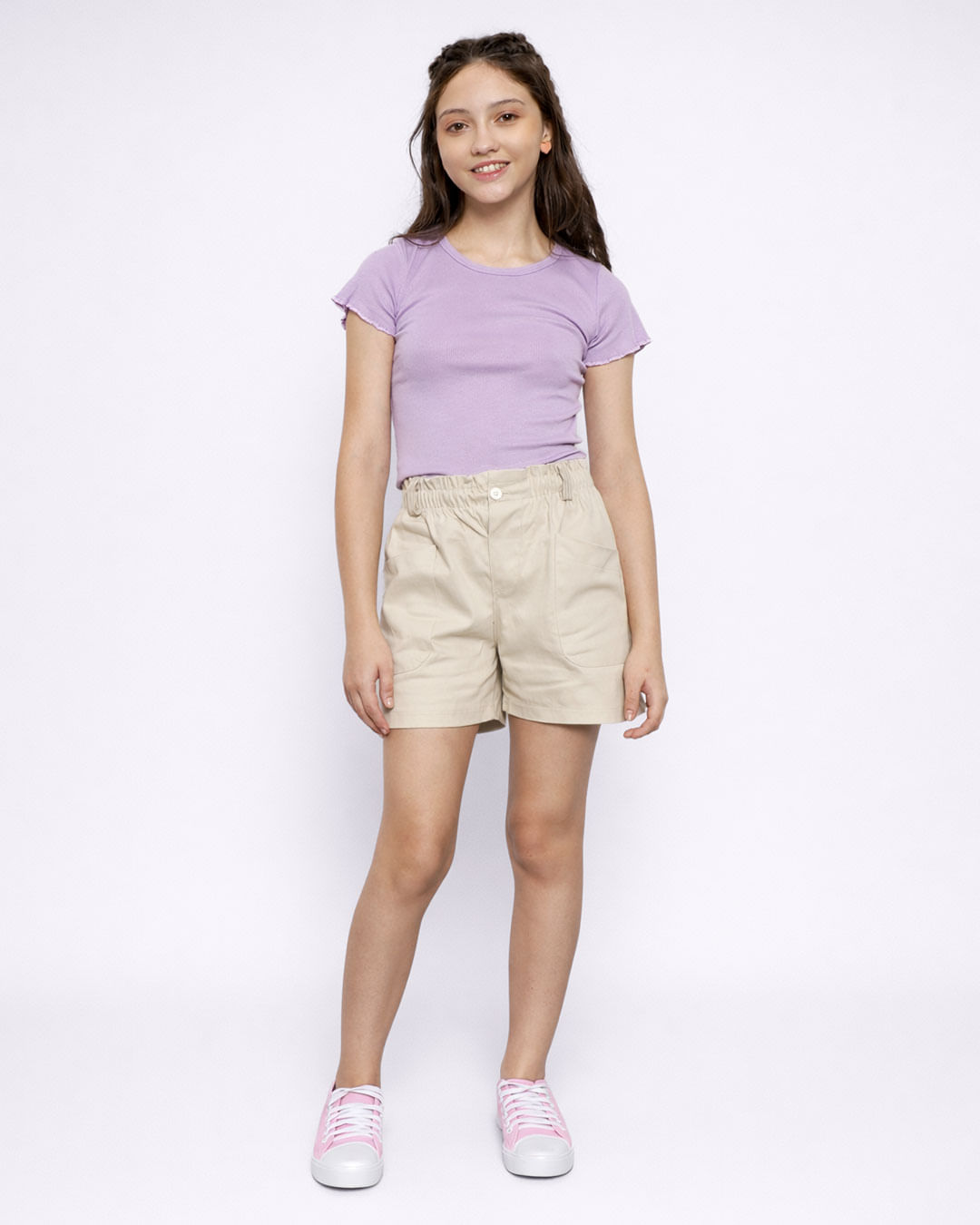 Short juvenil confeccionado em tecido sarja. Possui modelagem paper bag, cós com elástico e passantes, fechamento botão, cordão interno de ajuste, bolsos frontais. Barra simples com acabamento e costura padrão.