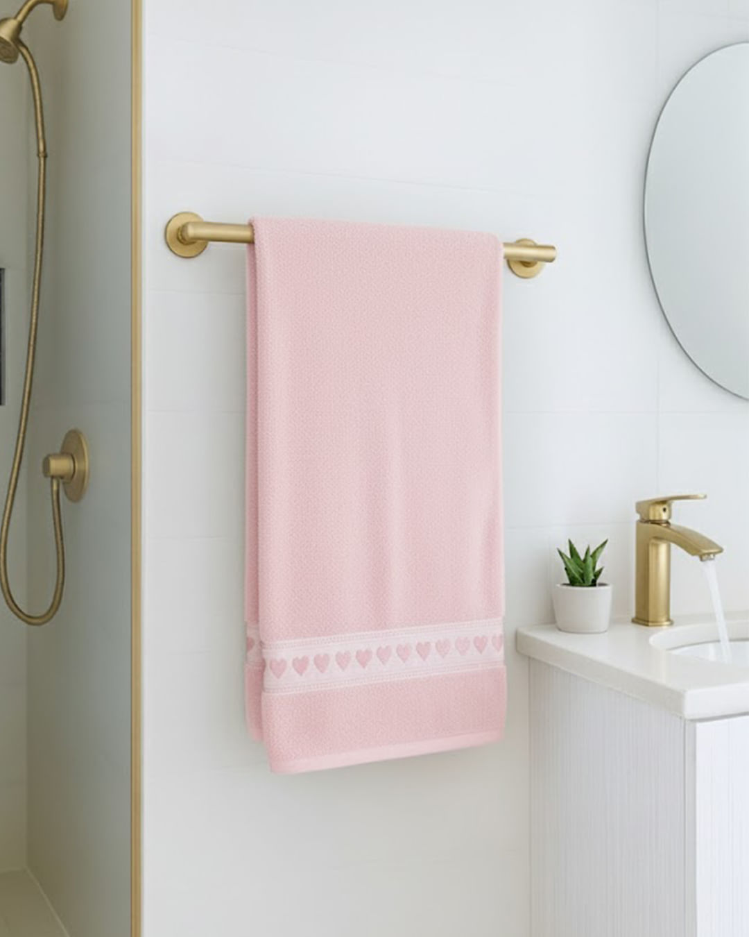 Toalha de banho confeccionada em algodão, possui alta absorção, faixa texturizada, estampa com bordados e barra comum com costura e acabamento padrão.