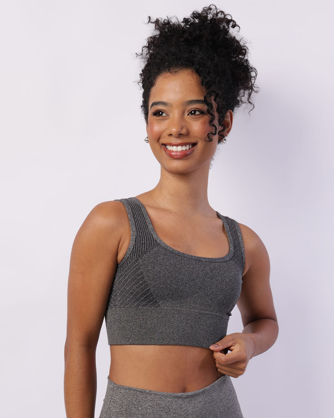 Produto OriginalMais detalhes: Top fitness feminino possui alças, bojo removível, recortes texturizados e sem costura com barra elástica e acabamento padrão.