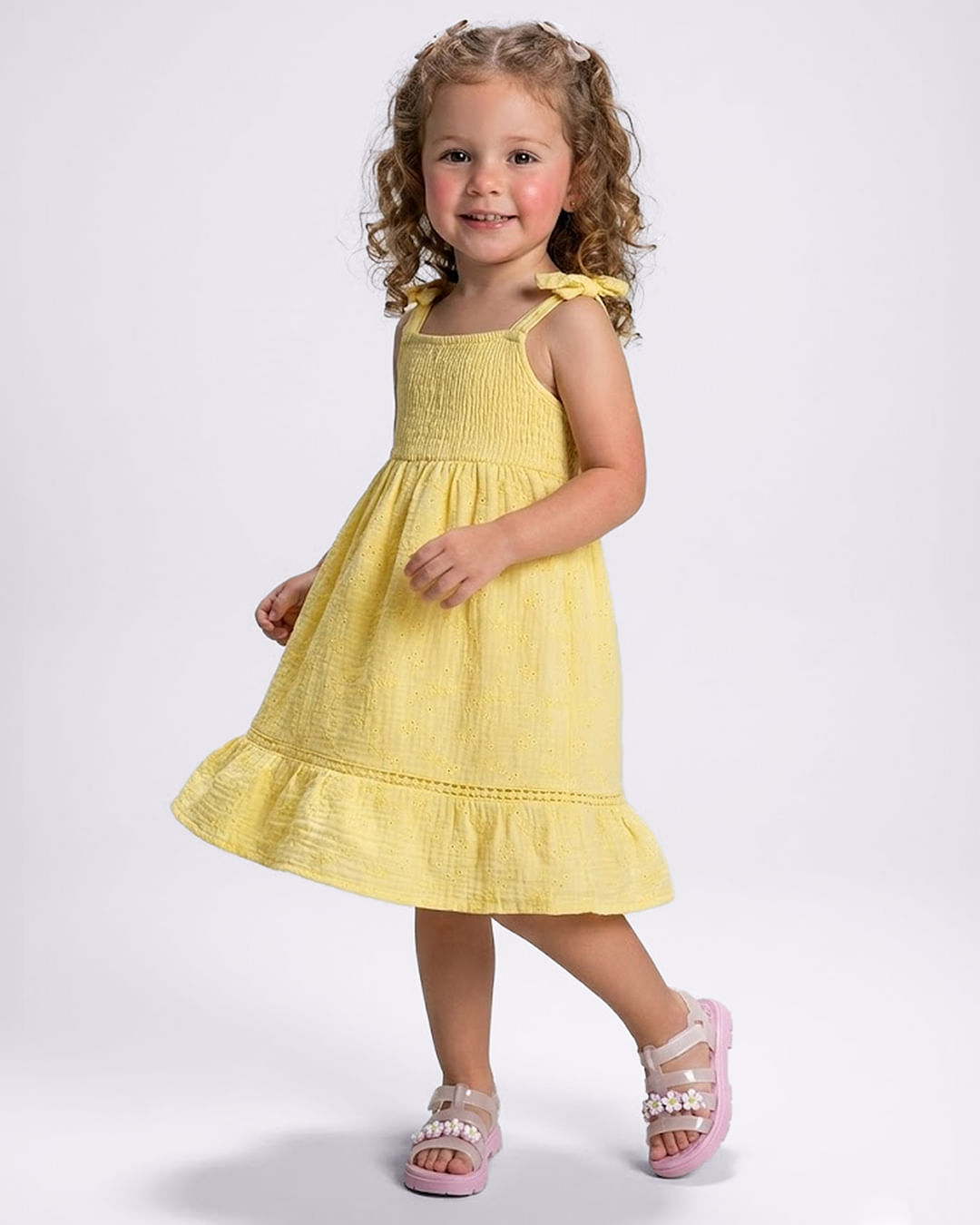 Vestido bebê confeccionado em malha algodão. Laise. Modelagem curto, possui decote reto, alças com lacinho decorativo, parte superior com lastex. entremeio com ponto palito na barra, com costura e acabamento padrão.