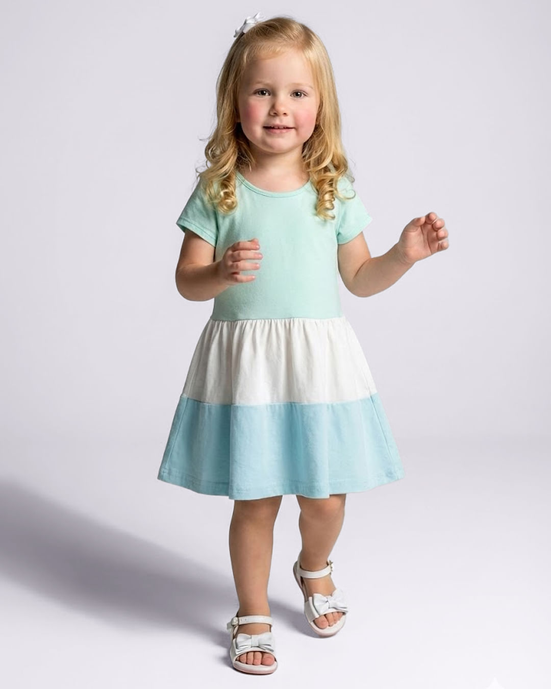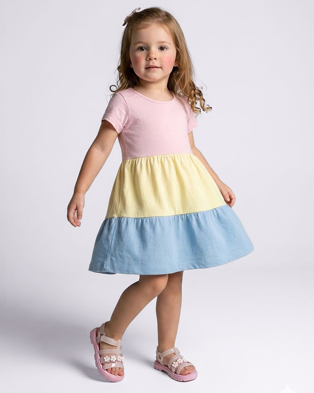 Vestido bebê confeccionado em malha de algodão. Modelagem 3 marias, possui decote redondo, manga curta , peça com tecido em três cores. Costura e acabamento padrão.