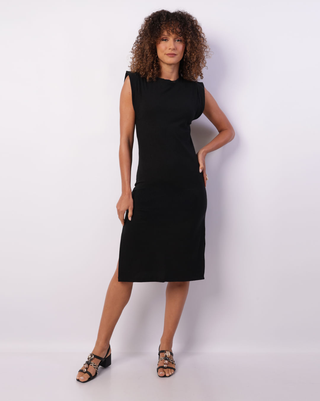 Mais detalhes: Vestido feminino com tecido canelado, modelagem curto, sem mangas, decote redondo e fenda. Com costura e acabamento padrão.