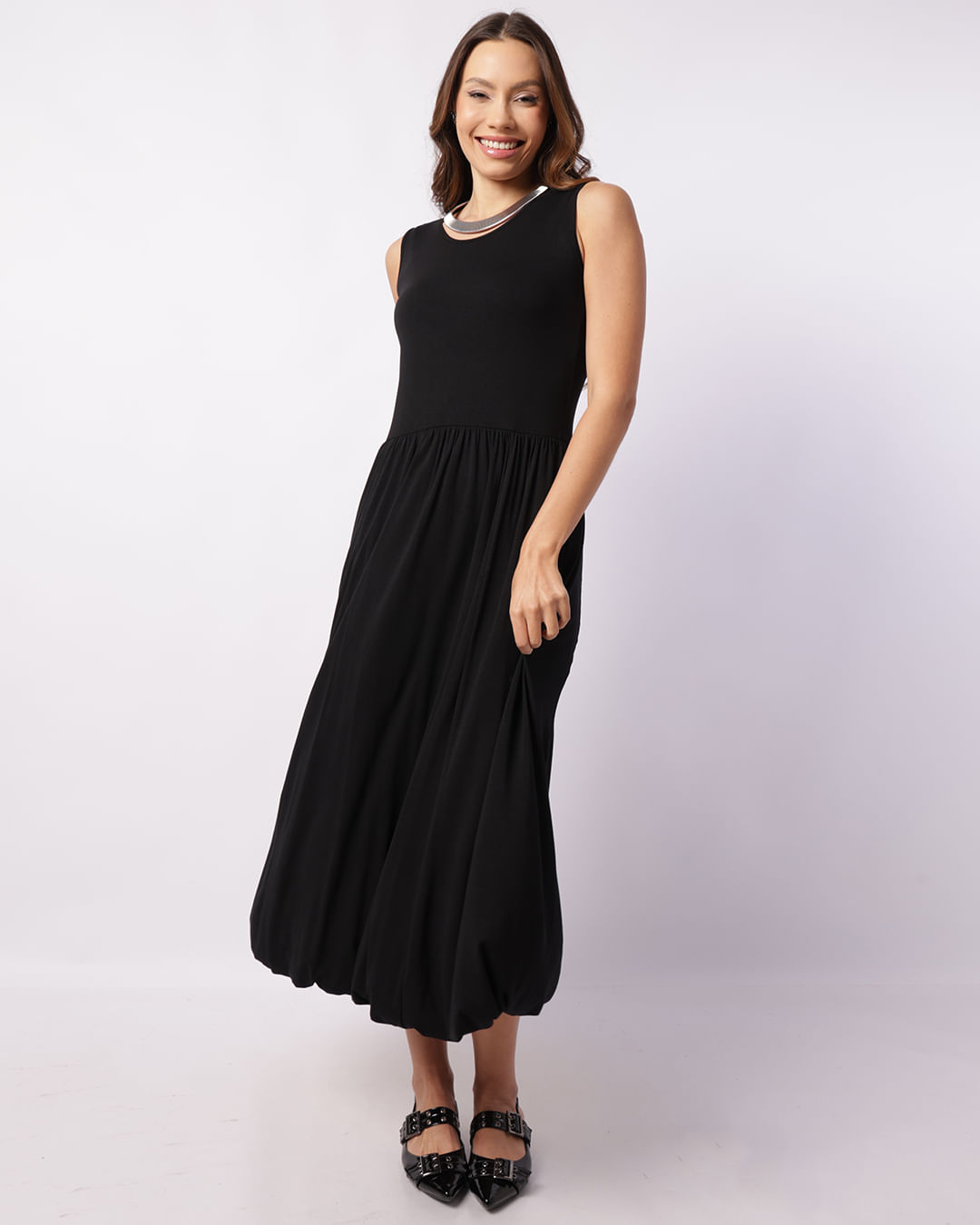 Mais detalhes: Vestido feminino possui modelagem mídi, decote redondo, manga curta e fechamento posterior com botão e barra balonê com costura e acabamento padrão.