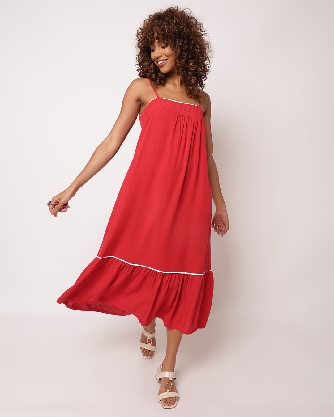 Mais detalhes: Vestido feminino confeccionado com 100% viscose. Possui modelagem midi, alcinha ajustável, barra com babado e detalhe vivo no decote e barra. Costura e acabamento padrão;)
