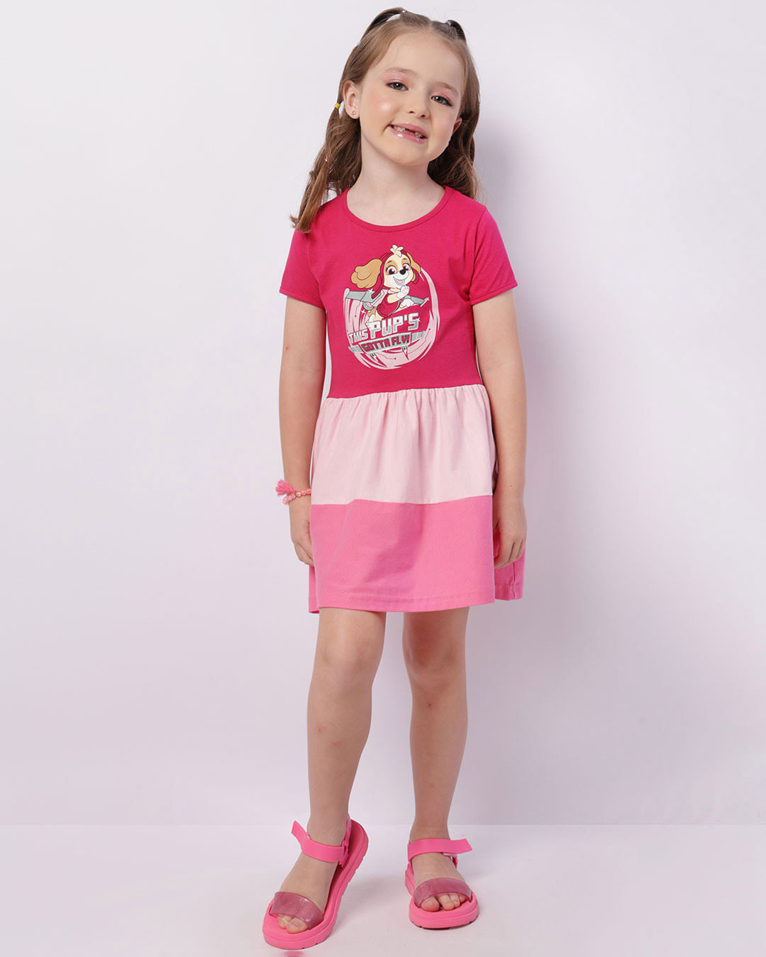 Vestido infantil confeccionado em malha, possui modelagem curto três Marias, manga curta, recortes em diferentes tons e barra comum, peça com a estampa da personagem Everest da Patrulha Canina com costura e acabamento padrão.