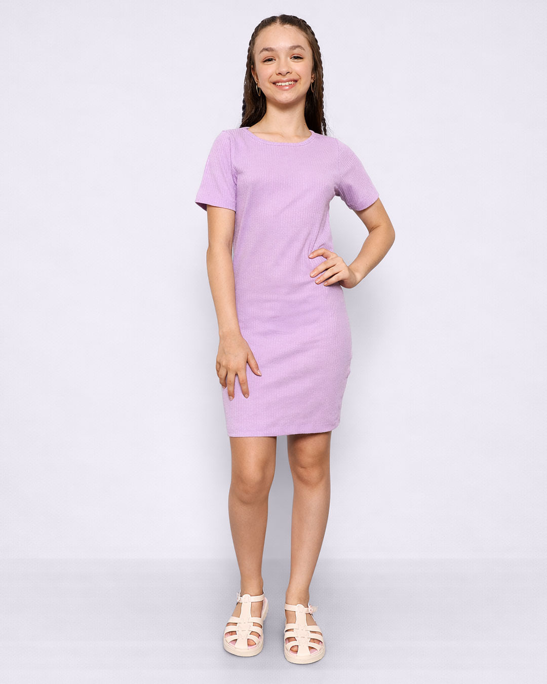 Vestido juvenil confeccionado em malha canelada, possui modelagem curta, decote redondo, manga curta e barra comum , peça com costura e acabamento padrão.